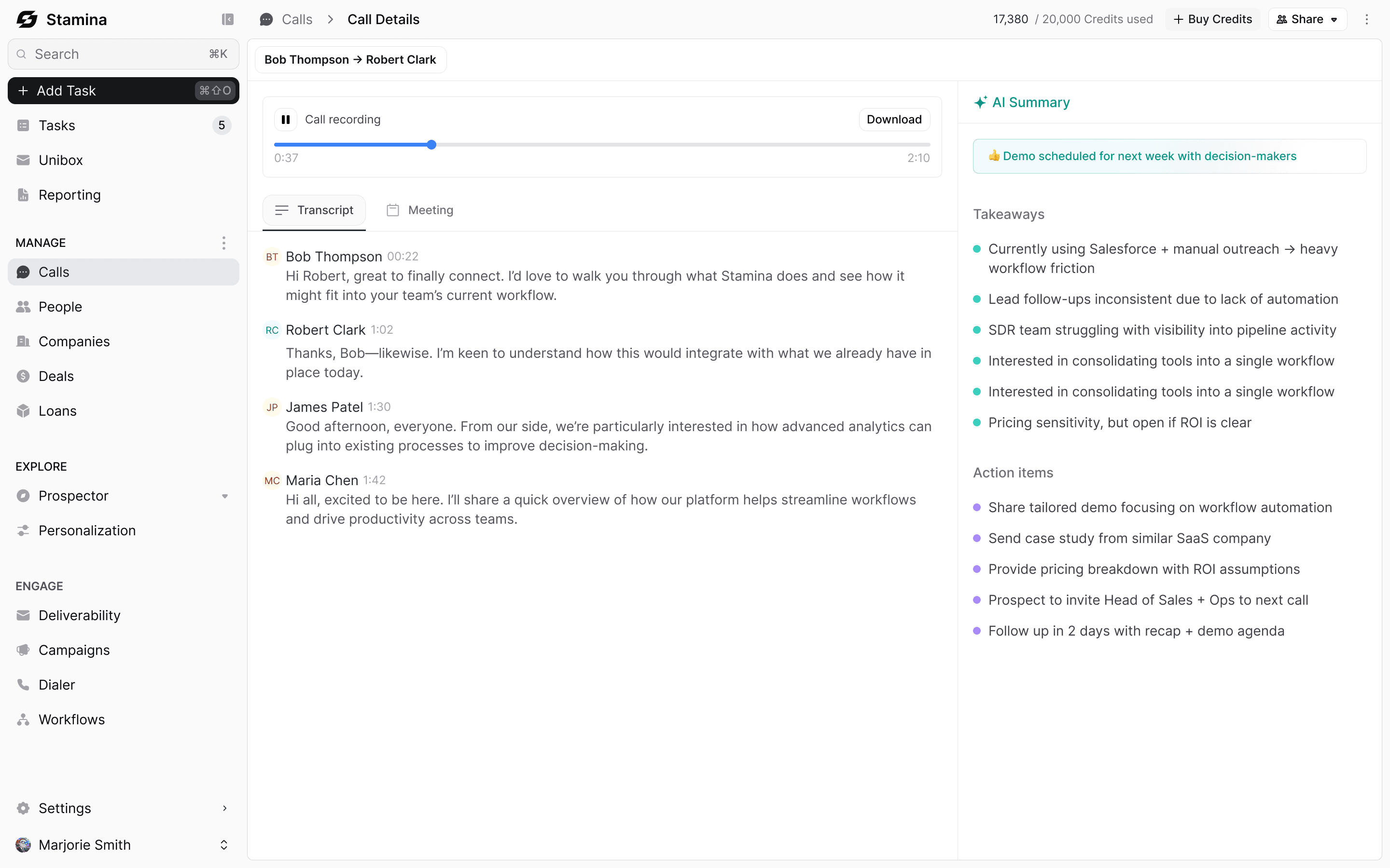 Stamina's notetaker joins automatically, records the conversation, and gets to work. Summaries, transcripts, action items, and coaching insights — ready before you've closed the tab.