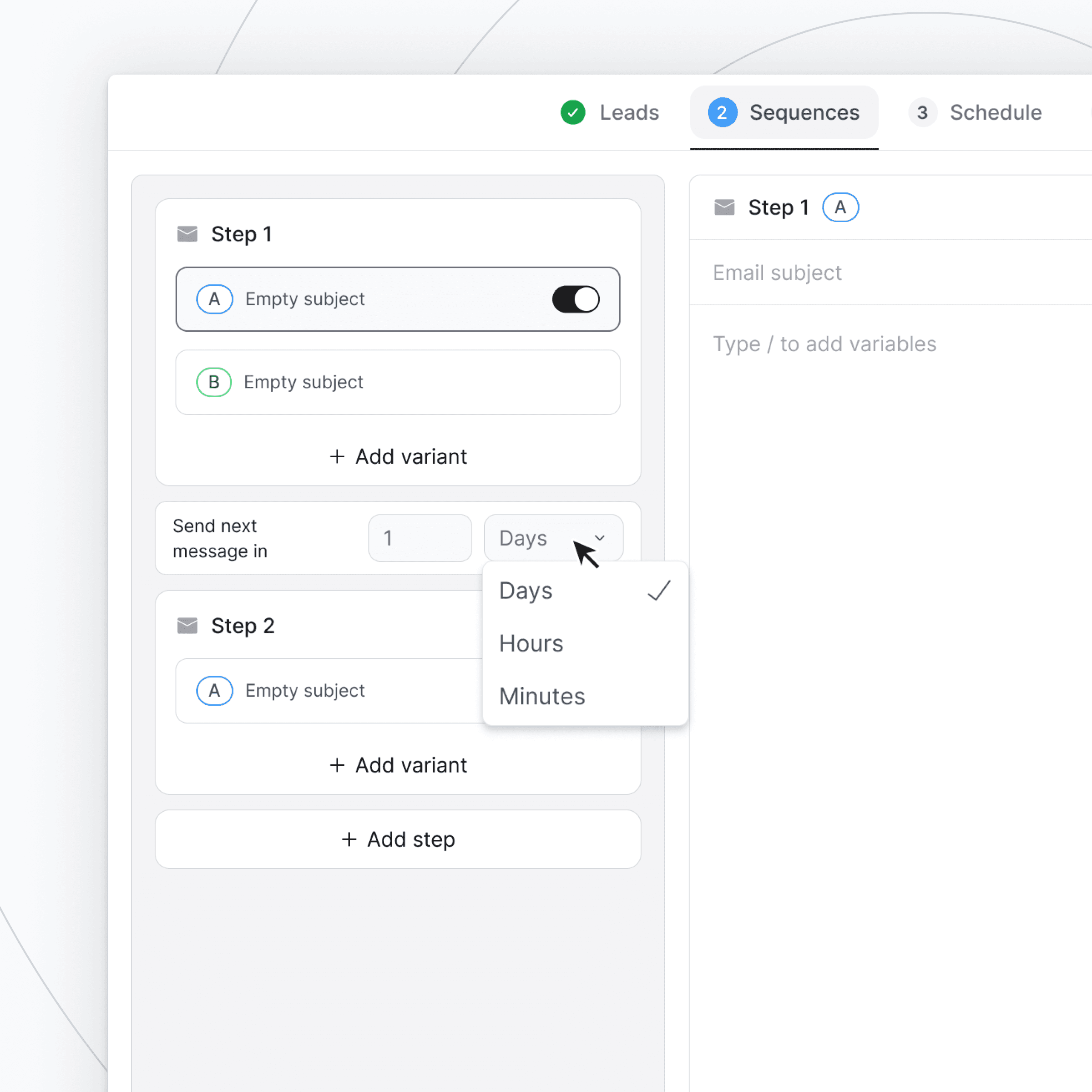 Build multi-step sequences in minutes. Add A and B variants to any step, set your send intervals in days, hours, or minutes, and Stamina automatically tracks which version drives replies. No spreadsheets. No guesswork. Just a clear winner.