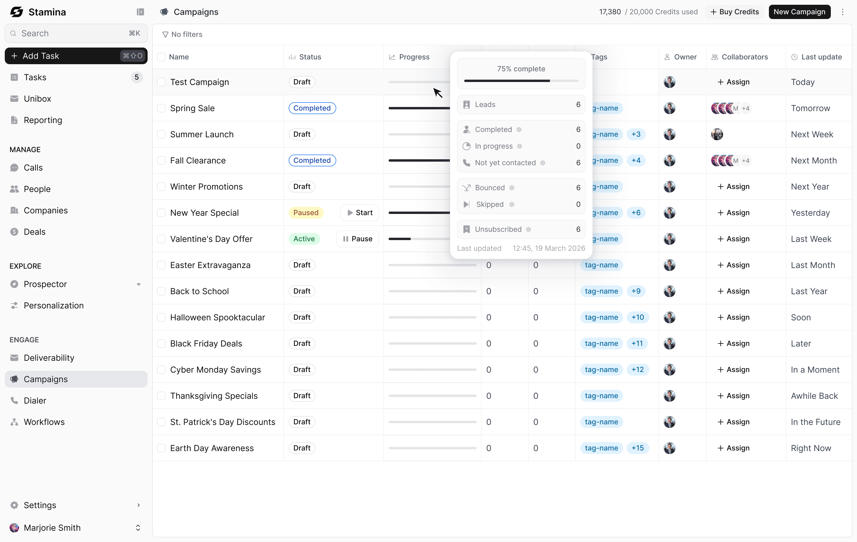 Build multi-step campaigns, A/B test every message, and let Stamina handle the timing, rotation, and optimization. You set the strategy. The platform does the rest.