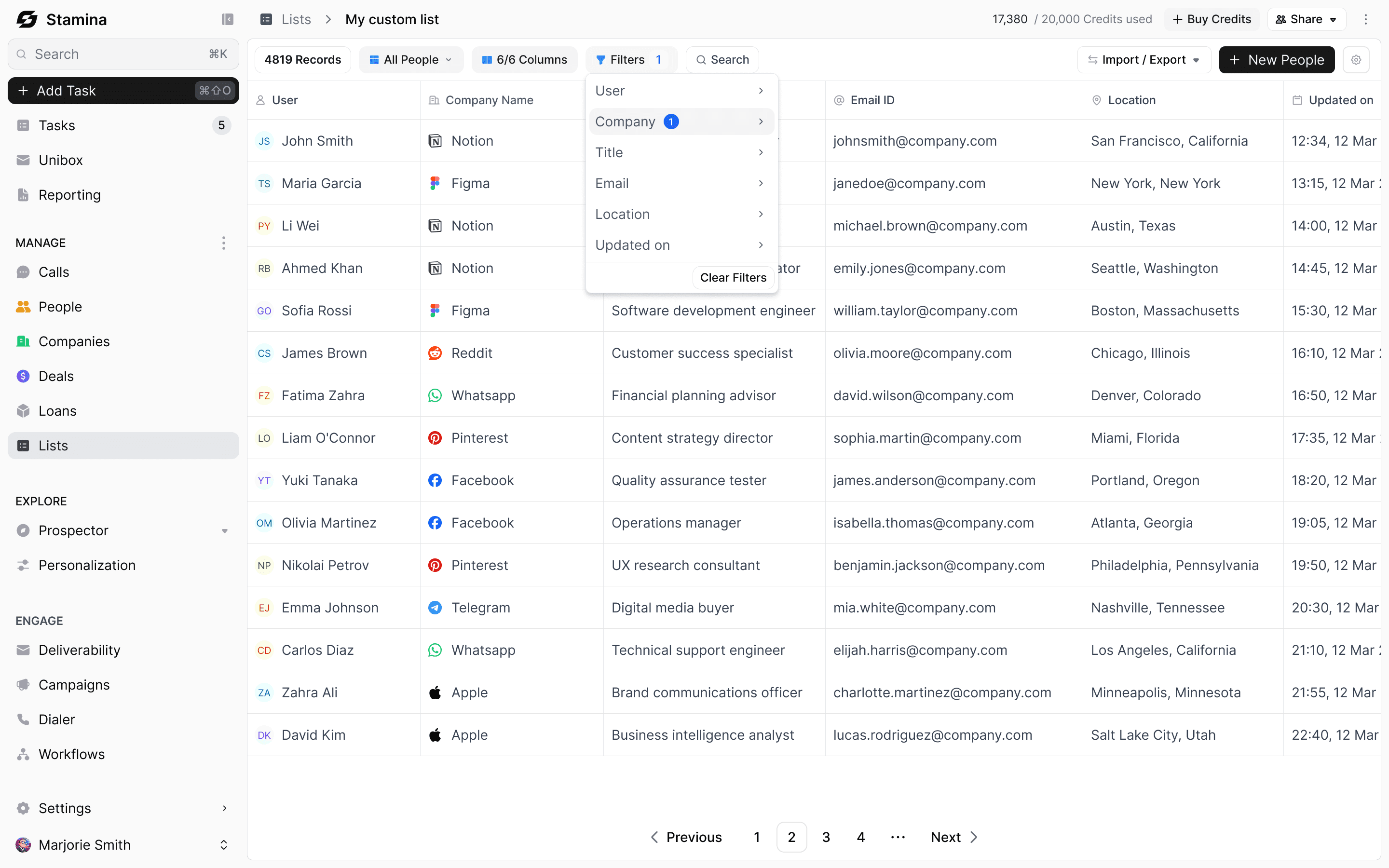 Lists are saved, filtered views of any object in Stamina. Build a list of enterprise accounts in fintech, warm leads from last quarter, or contacts assigned to a specific rep. Come back to it anytime. Share it with your team. Push it straight into a campaign.