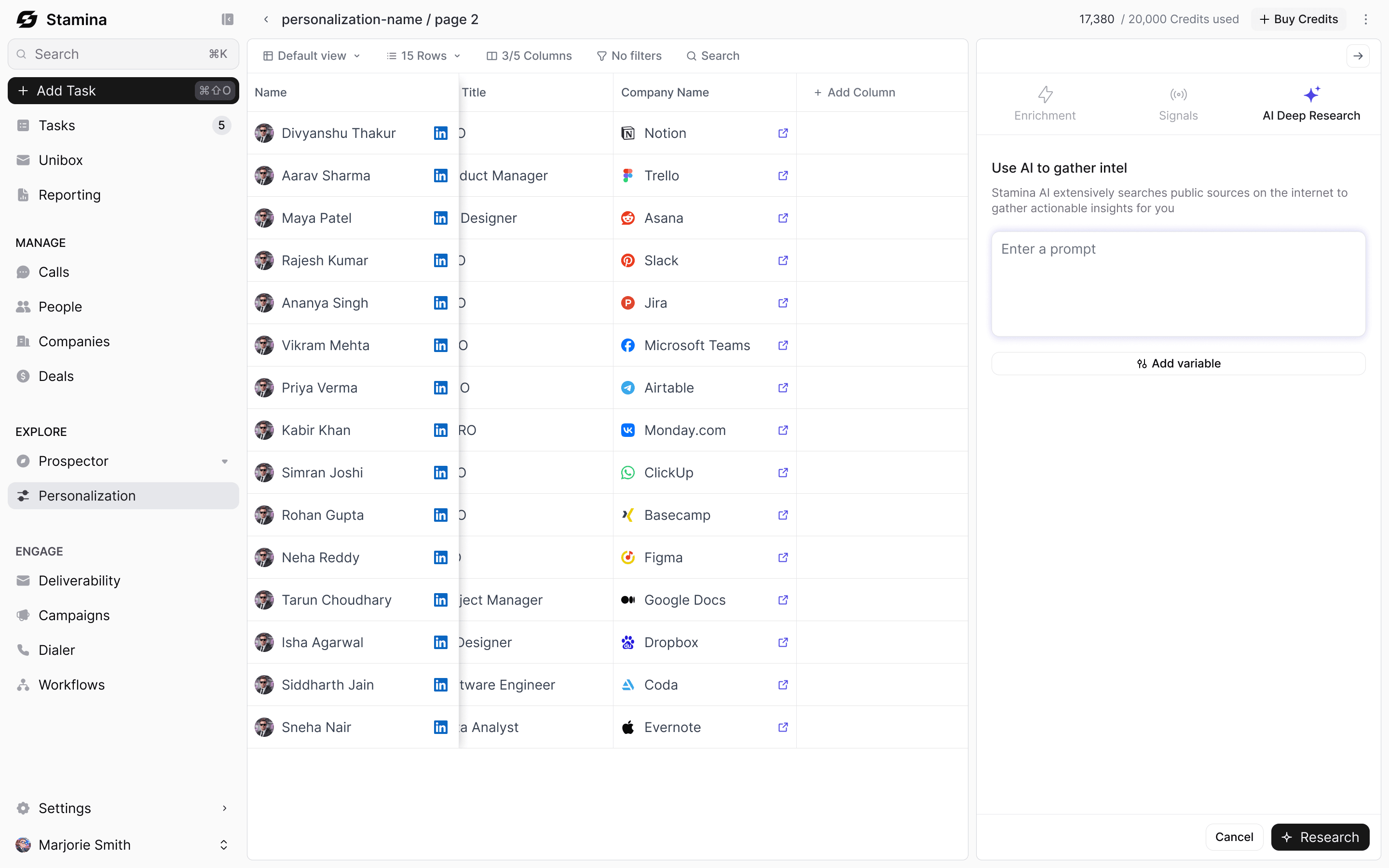 Before your team writes a single word, Stamina has already scanned every prospect's LinkedIn profile, recent company activity, open job postings, funding announcements, and website positioning. The right personalization signal is surfaced automatically for each contact.